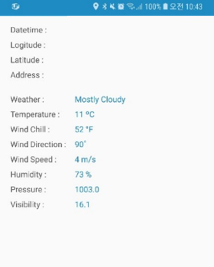 이제 1분 마다 날씨 정보를 불러올 수 있게 되었습니다. 현재 위치, 시간, 온도, 습도, 대기압, 풍향, 풍속 등의 다양한 날씨 정보를 화면에 표출하여 완성하였습니다.