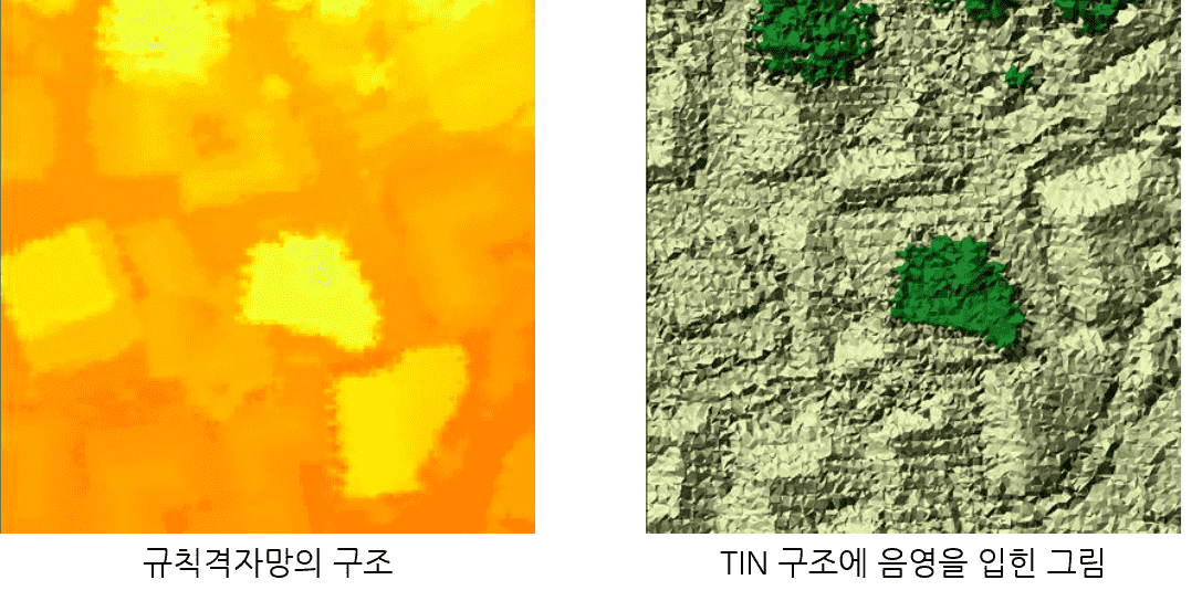 - 불규칙삼각망은 원래의 자료 점들을 Delaunay 삼각망을 활용하여 불규칙한 형태의 연속적인 삼각형을 연결시켜 지형의 기복을 표현합니다.