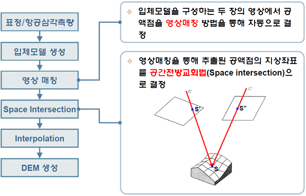 - 항공사진을 스캐닝하거나 항공사진 측량용 디지털카메라로 획득한 항공 영상을 이용하여 수치도화기에서 자동으로 DEM을 추출하는 방법