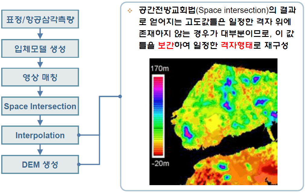 - 항공사진(또는 항공영상)을 이용한 DEM 구축 방법은 현재 실용화된 방법 중 가장 정확하고 최신의 수치 고도 자료를 얻을 수 있습니다.