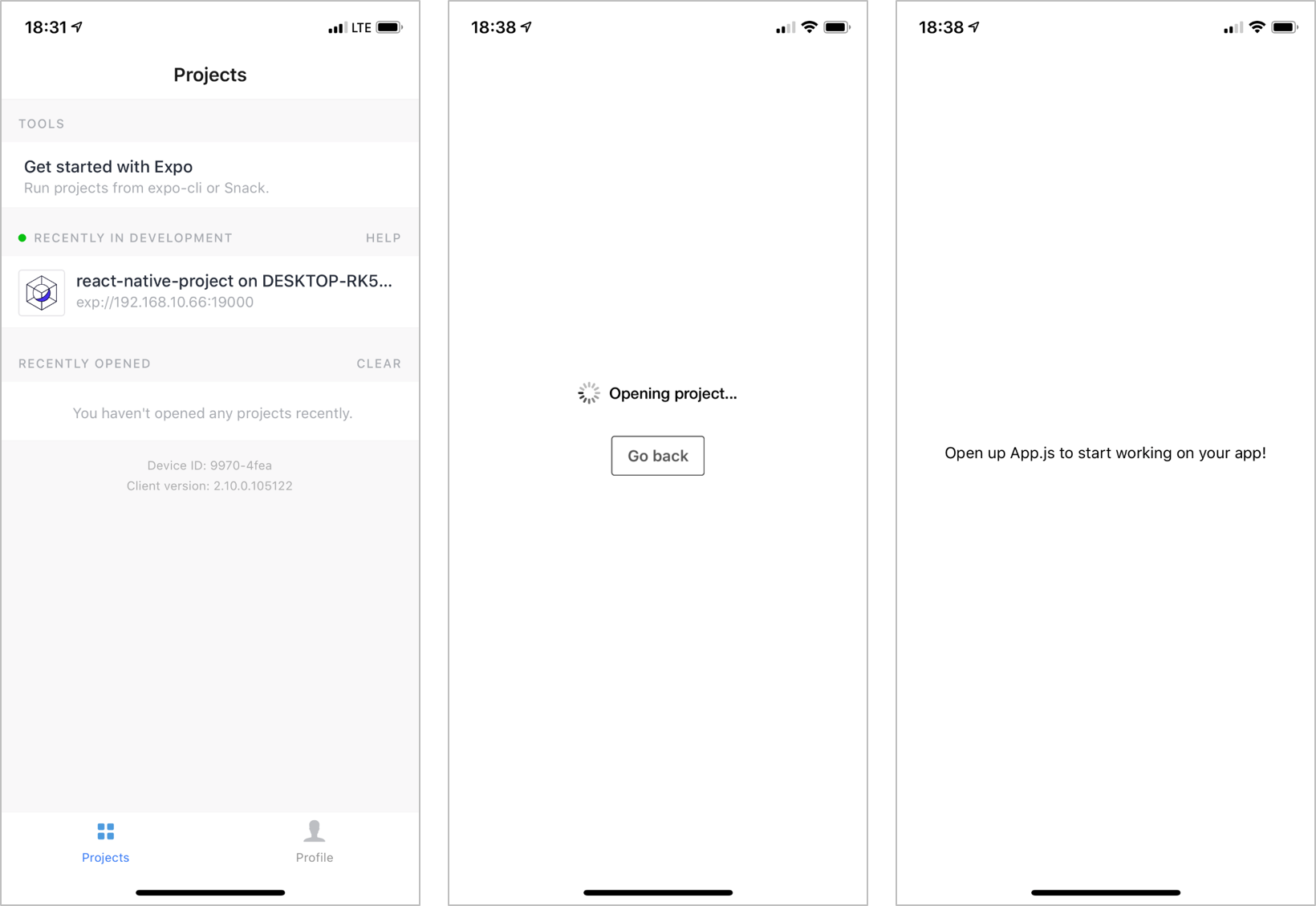 "Expo client" 앱을 실행하고 생성한 계정정보를 입력합니다. 로그인 성공 후 하단에 있는 Projects 탭을 클릭합니다. 그러면 Publish 성공한 프로젝트가 보입니다. 프로젝트를 클릭하면 우리가 작업한 화면이 보일 것입니다. 코드를 수정하면 바로 앱에서 변경되는 것을 확인할 수 있습니다.