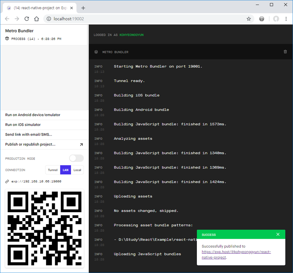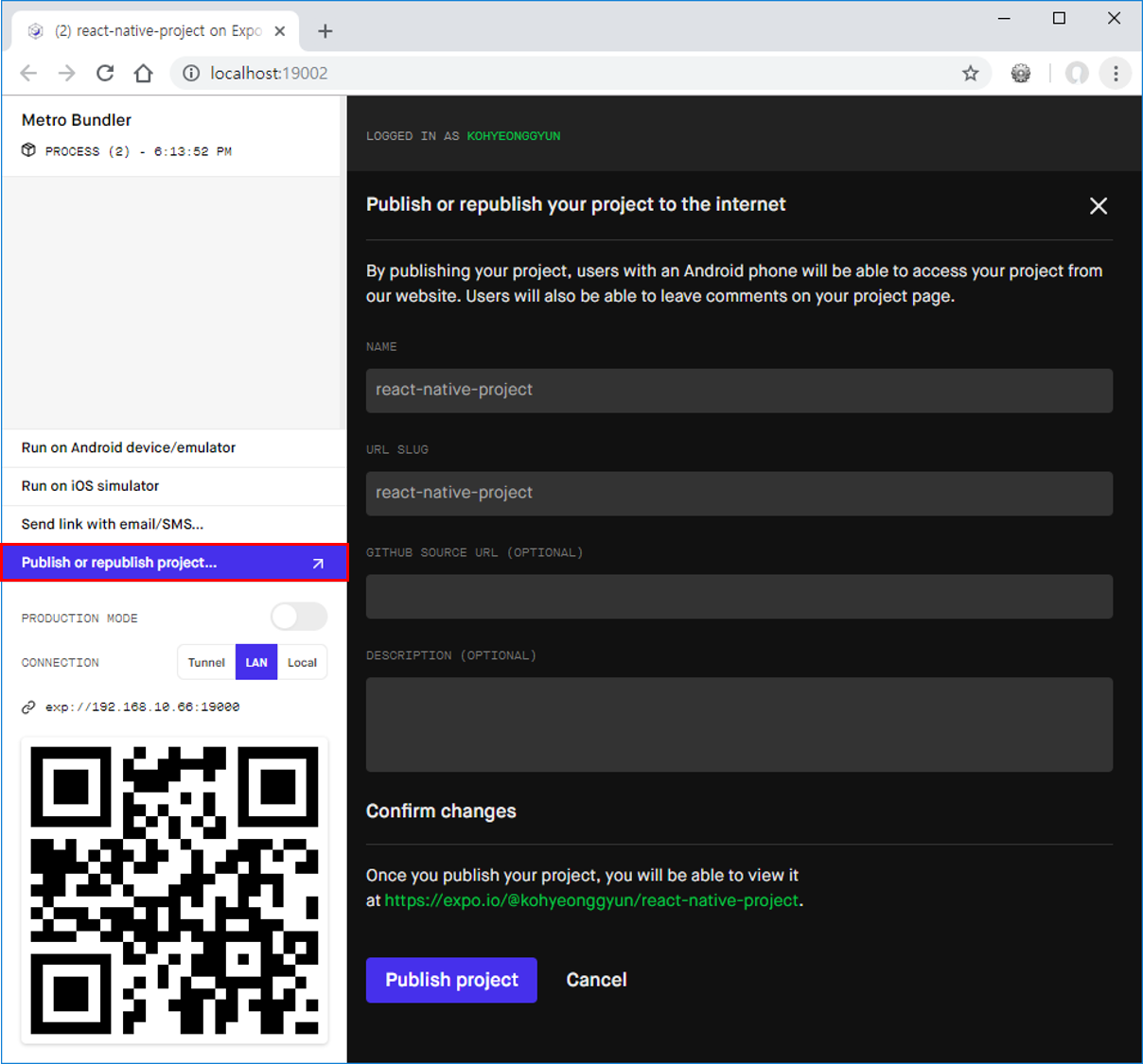 먼저 Expo 홈페이지에서 계정을 생성합니다. 그런 다음 모바일에서 "Expo client" 앱을 설치합니다. 그리고 프로젝트 실행 화면에서 Publish or republish project... 을 클릭하고 내용을 입력 후 Publish Project 버튼을 클릭합니다.