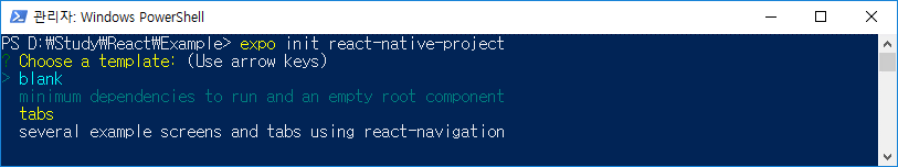 프로젝트 생성할 때는 expo init <프로젝트 이름> 명령어를 사용합니다.