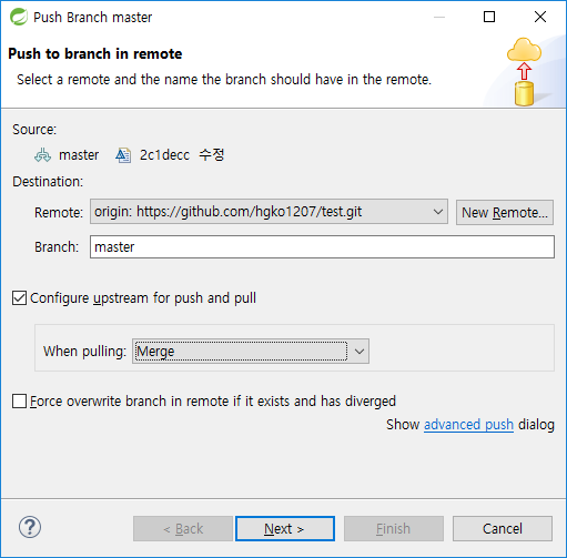 Branch에 push 하기 과정인데 이 부분은 패스하겠습니다. [Next] 버튼을 클릭합니다.