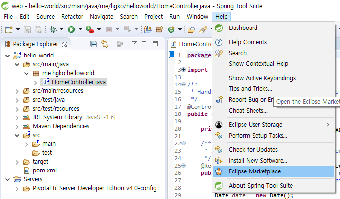 이클립스를 실행하고 Help -> Eclipse Marketplace를 클릭합니다.