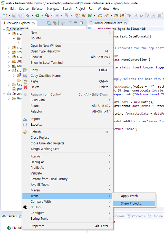 개발하고 있는 프로젝트와 연동하기 위해 작업을 합니다. 프로젝트를 마우스 우클릭 후 그림처럼 [Team] -> [Share Project]를 클릭합니다.