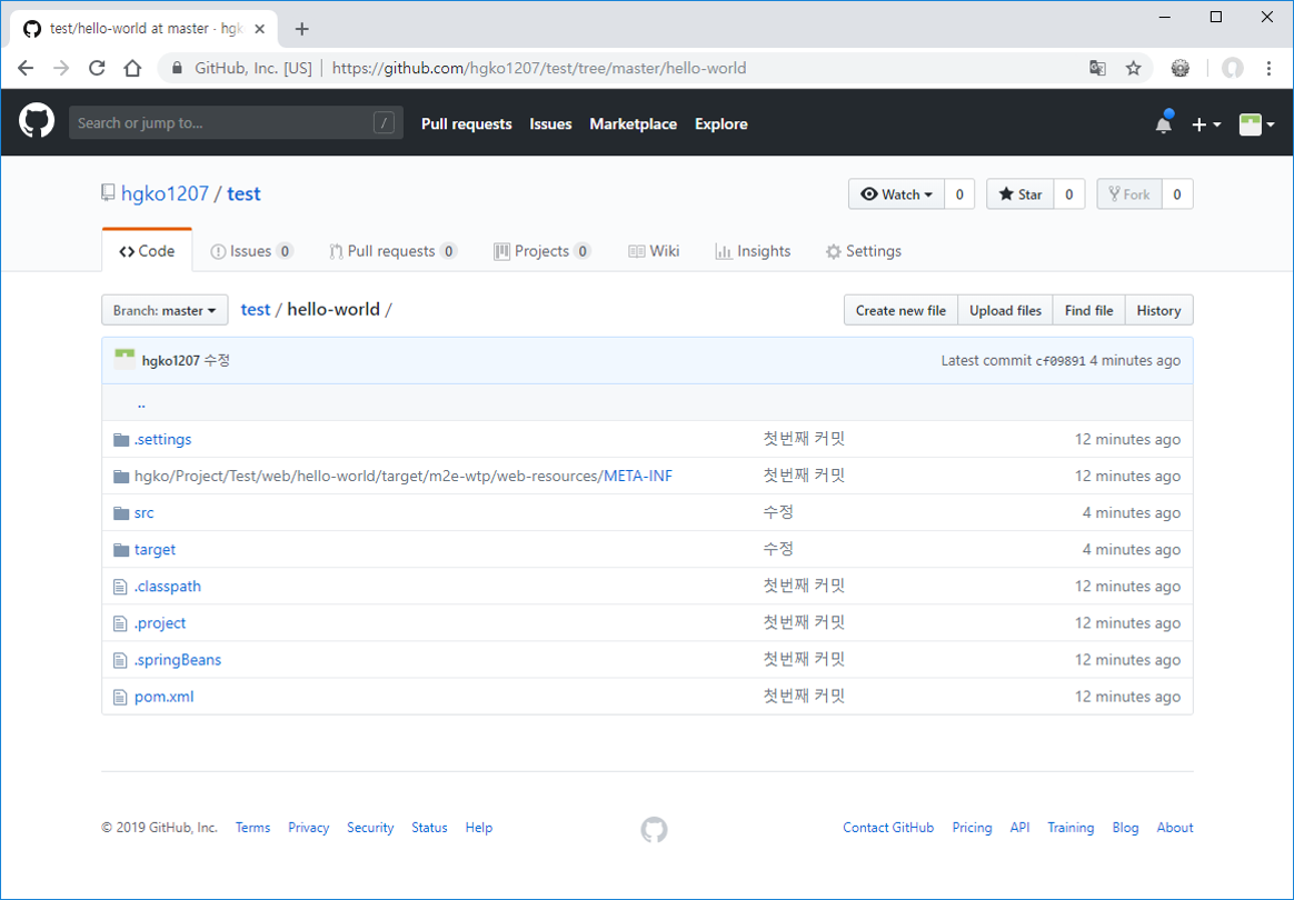GitHub 홈페이지를 가서 Push 된 프로젝트를 확인할 수 있습니다. 그림처럼 프로젝트가 올라가 있고 수정된 이력도 보입니다. 이클립스에서 소스 코드를 수정하고 위에서 본 Commit 과정과 같이 하면 프로젝트를 관리할 수 있습니다.
