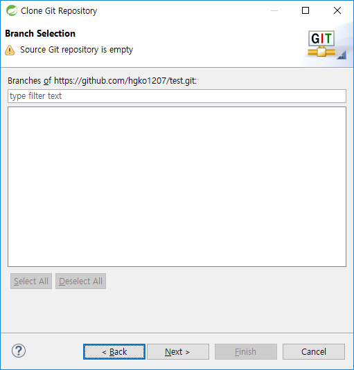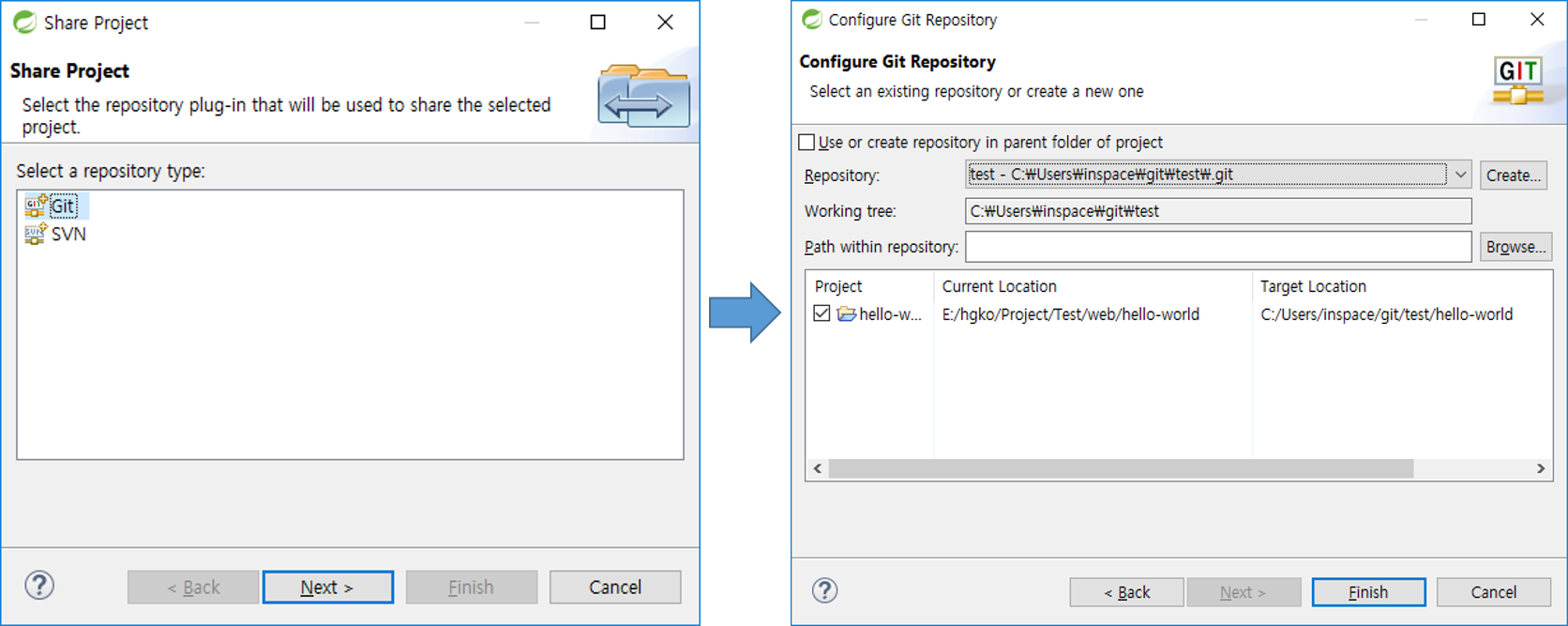 Git을 선택하고 [Next] 버튼을 클릭합니다. 그런 다음 Repository 란에서 앞에서 생성한 저장소를 설정해 주고 [Finish] 버튼을 클릭합니다.