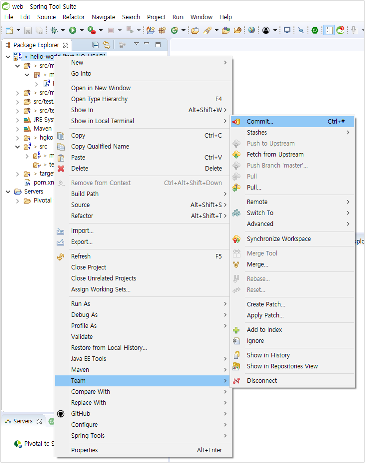 원격 저장소에 첫 번째로 커밋을 합니다. 프로젝트를 마우스 우클릭 후 [Team] -> [Commit]을 클릭합니다.