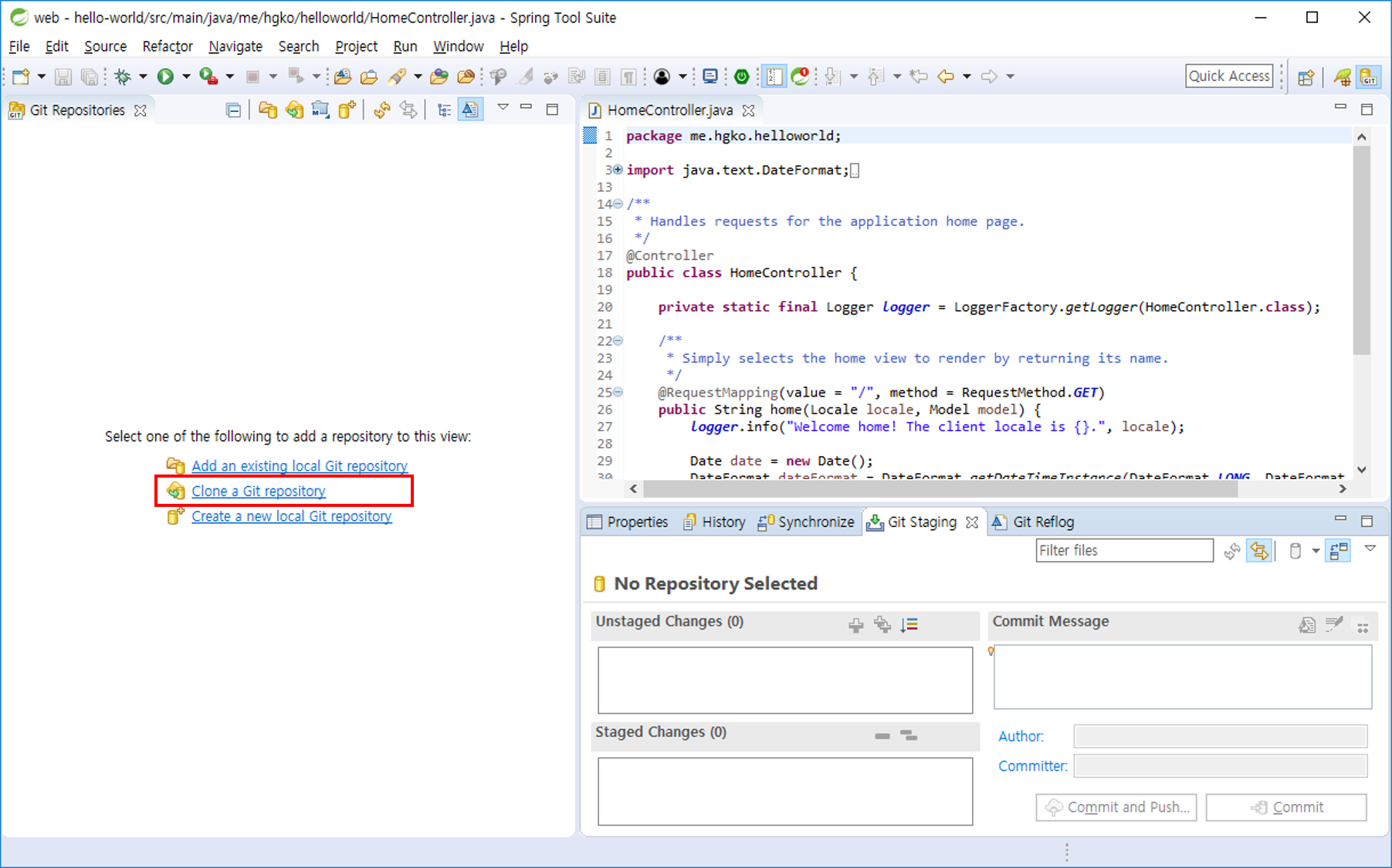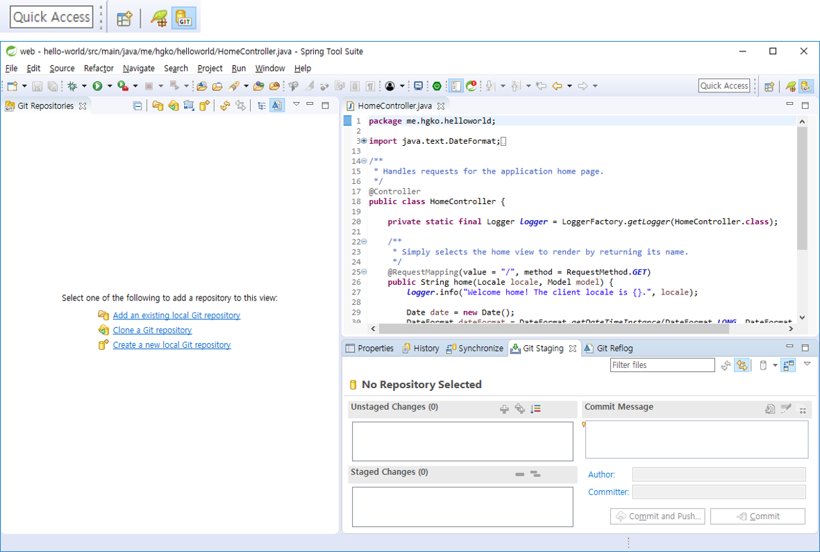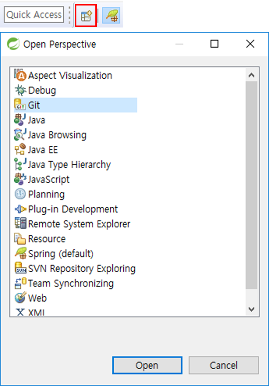 Git을 선택하고 [OK] 버튼을 눌러 활성화시킵니다. Git 퍼스펙티브가 추가된 것을 볼 수 있으며 아이콘을 클릭하면 아래 그림처럼 기본화면이 변경됩니다.
