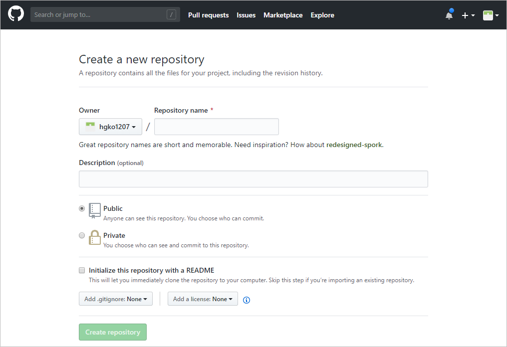 먼저 공식 사이트인 https://github.com/ 에서 회원가입을 합니다. 회원가입 후 로그인을 하고 "Start a project" 버튼을 클릭합니다. 아래 그림처럼 화면이 나옵니다.