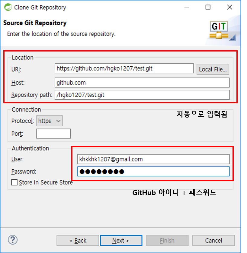 첫 번째 빨간 박스에서 앞에서 복사해 둔 Git 원격 저장소 주소를 URI 칸에 복사하면 Host, Repository path 칸에 자동으로 입력됩니다. 그 밑의 빨간 박스에는 깃허브 아이디와 패스워드를 입력하고 [Next] 버튼을 클릭합니다.