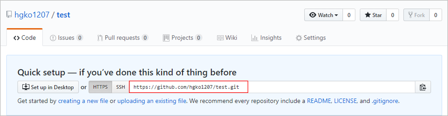 원격 저장소 이름을 입력하고 다른 것은 수정하지 말고 "Create repository" 버튼을 클릭하면 다음과 같은 원격저장소가 생성됩니다. 빨간 네모 박스의 경로를 복사해둡니다.