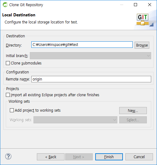 원격 저장소와 연결할 로컬 저장소를 설정한 뒤 [Finish] 버튼을 클릭합니다.