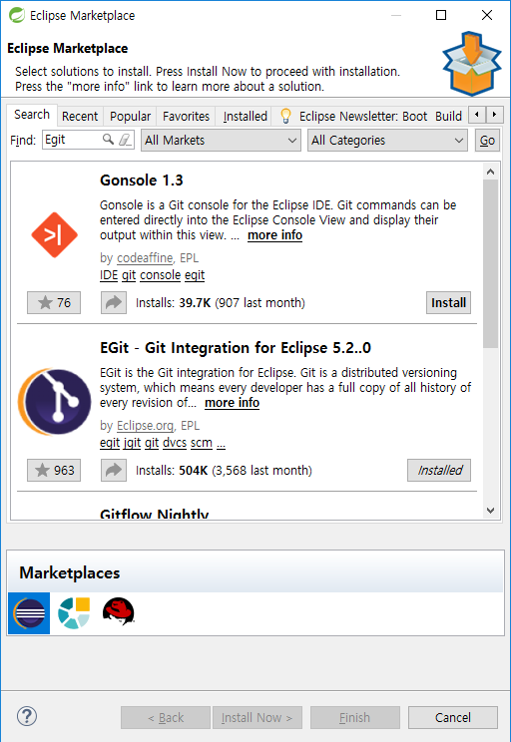 Marketplace에서 Egit를 검색합니다. 아래 그림처럼 EGit - Git Integration for Eclipse를 찾아 설치합니다. 설치가 완료되면 이클립스를 다시 실행하게 됩니다.