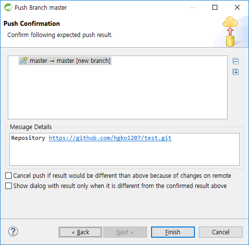 그럼 로그인 창이 뜰 텐데, GitHub의 아이디와 비밀번호를 입력하시고 [OK] 버튼을 클릭합니다. Push 확인 화면이 보이는데 확인하고 [Finish] 버튼을 클릭합니다.