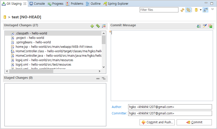 다음과 같은 화면이 뜨면 Commit Message 항목에 메시지를 작성한 후 프로젝트 파일 전체를 Staged Changes로 옮깁니다. 그런 후에 마지막으로 [Commit and Push] 버튼을 클릭합니다.