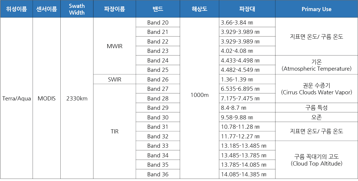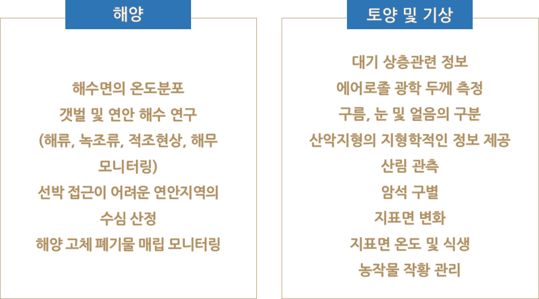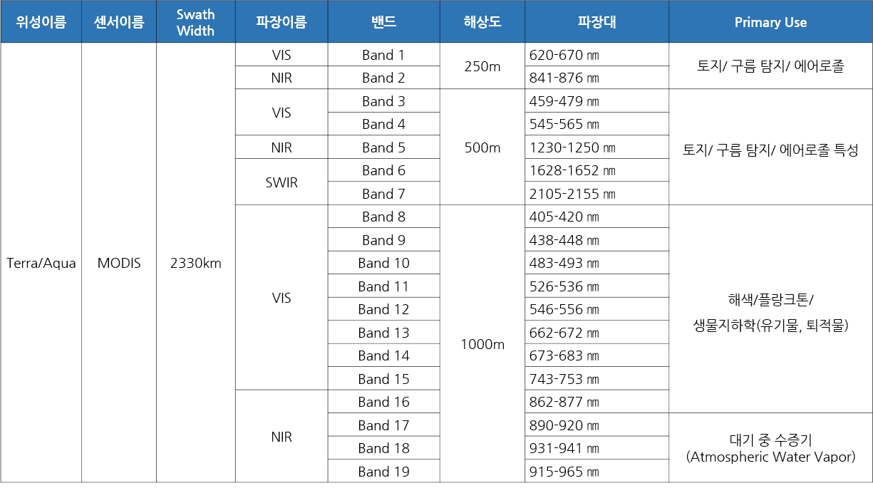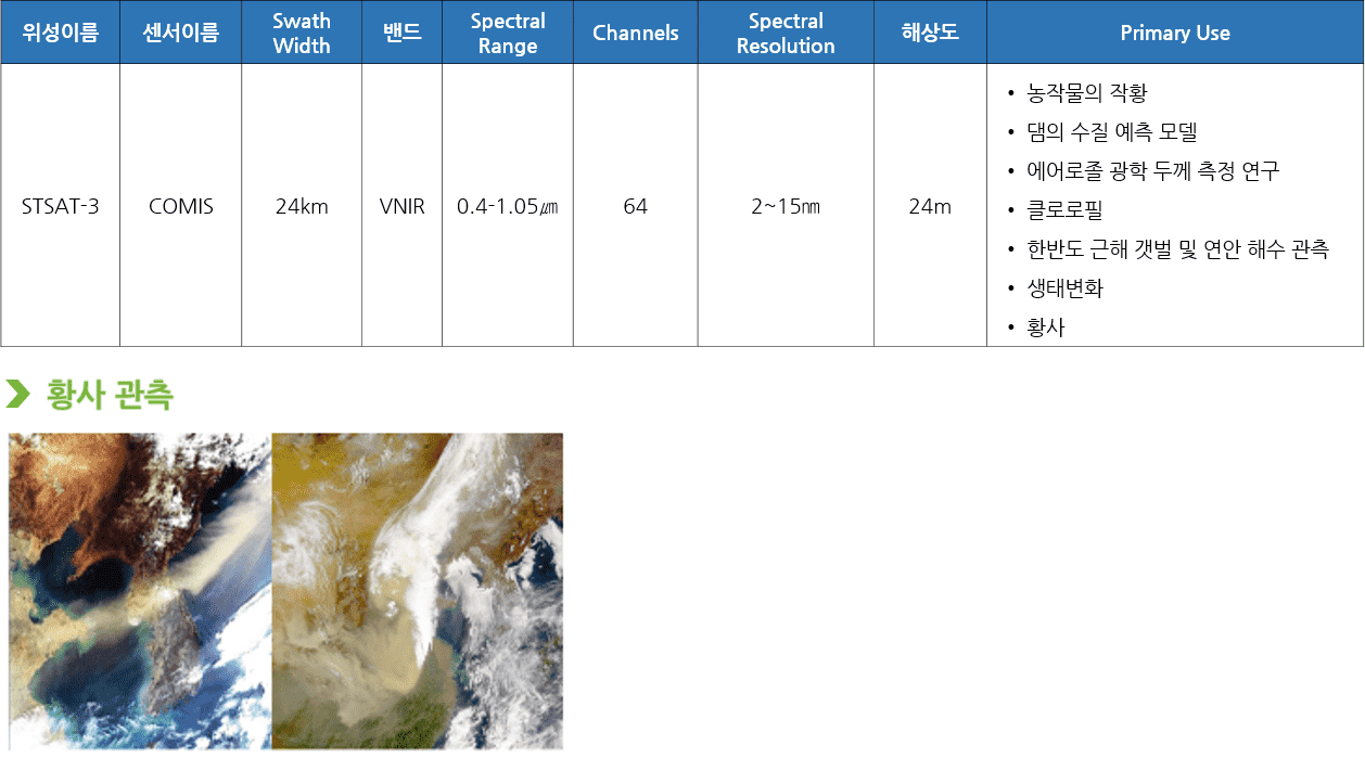 - 물질 고유의 광학적 성질과 물질의 흡수 및 반사 특징을 분석함으로써 토지피복, 식생, 그리고 수질 등의 식별에 주로 이용됨