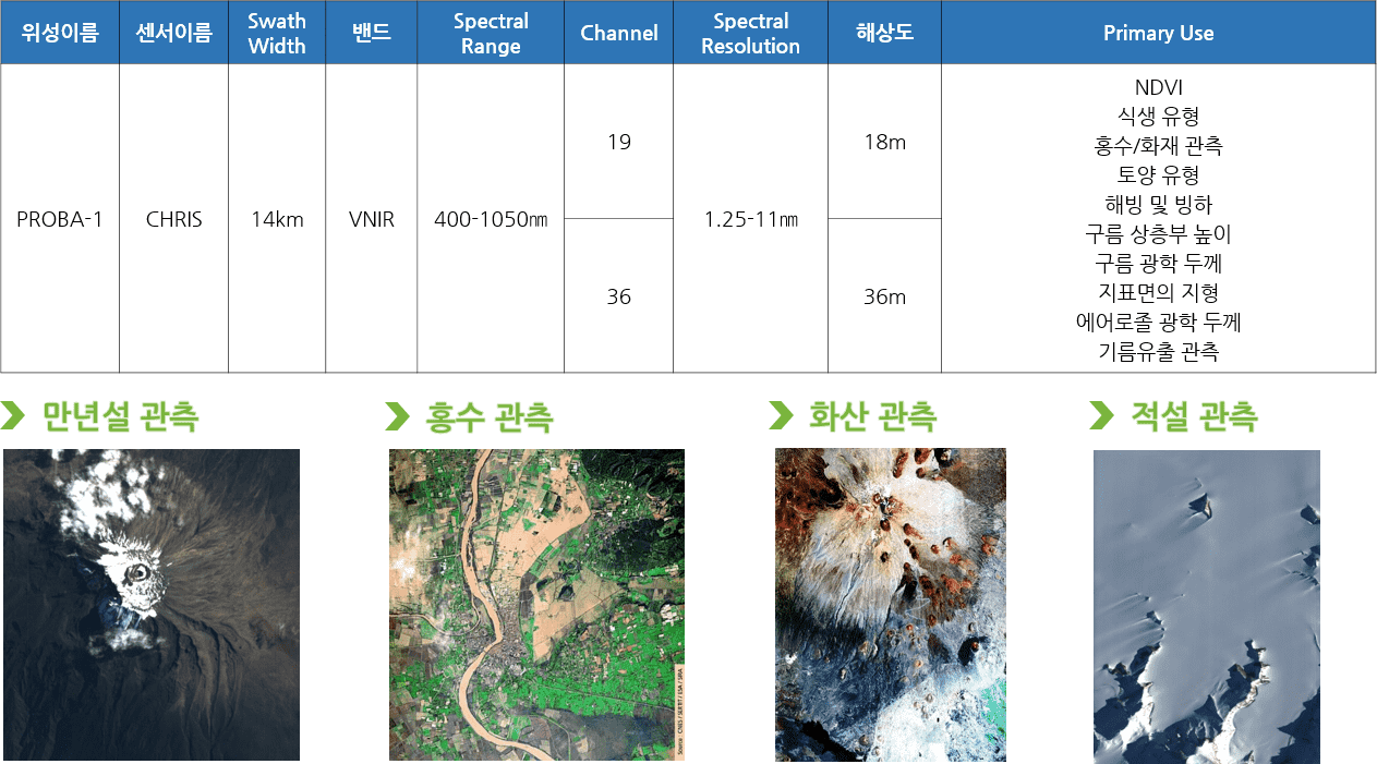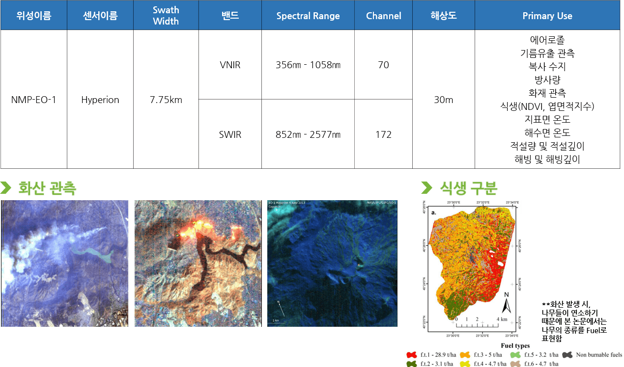 - 입사되는 빛을 분광시켜 영상의 각 화소에 해당하는 지표물의 수십에서 수백 개의 분광 정보를 취득하고 그 개체의 정보를 이미지 형태로 확보 가능
