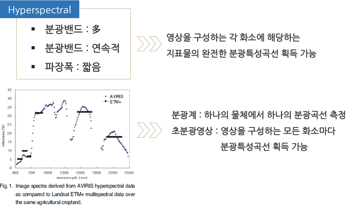 - 초분광 영상의 픽셀 분광은 하나의 표면에 대한 다중분광픽셀 스펙트럼에서 이용할 수 있는 것보다 훨씬 많은 정보 제공 가능