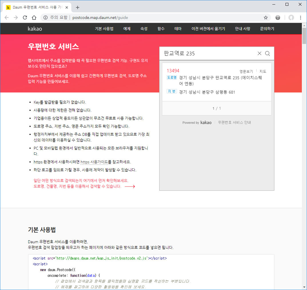 - 쉽고 간편하게 우편번호 검색, 도로명 주소 입력 기능을 만들 수 있습니다.