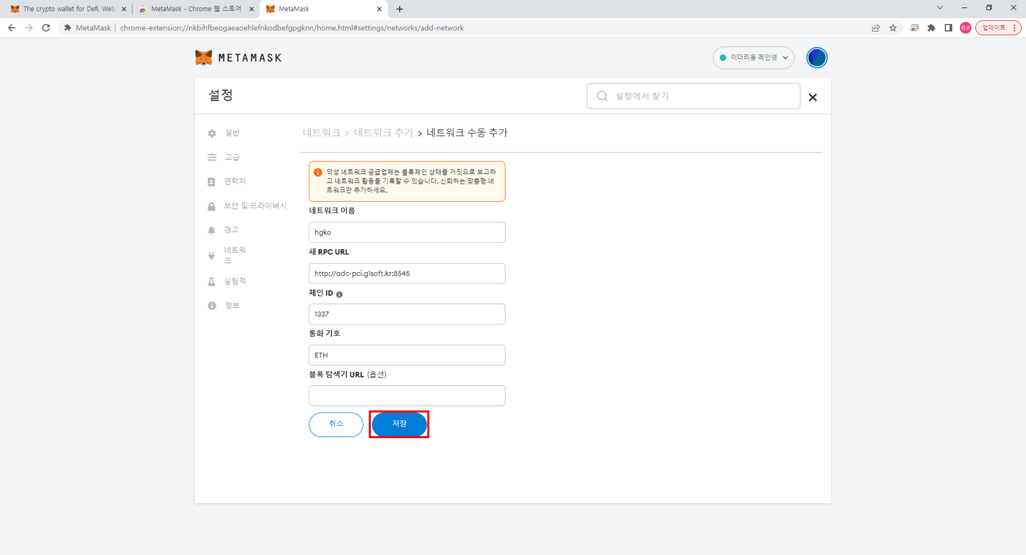 네트워크 이름, 새 RPC URL(ip 주소와 포트), 체인 ID(url을 입력하면 자동으로 찾아줌), 통화 기호를 입력하고 "저장" 버튼을 클릭합니다.
