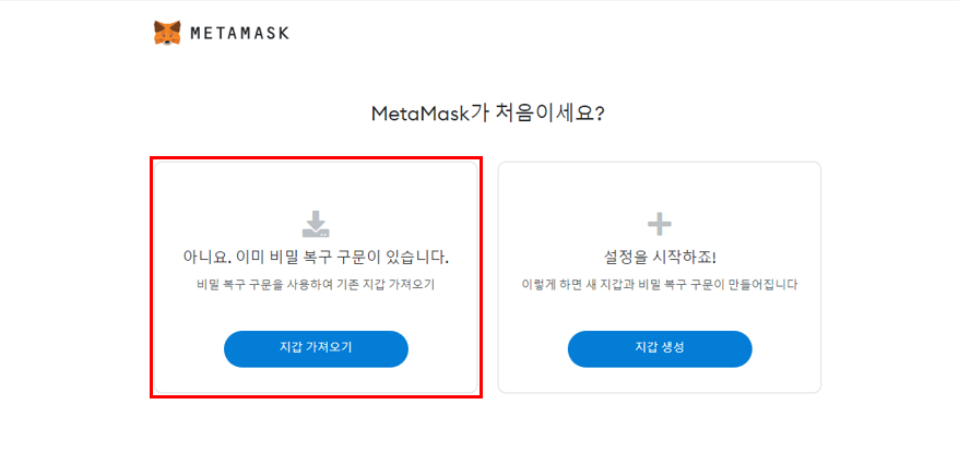 처음 사용하는 사용자라면 비밀 복구 구문을 사용하여 기존 지갑 가져오기와 새 지갑과 비밀 복구 구문 생성을 선택하는 화면이 보입니다.