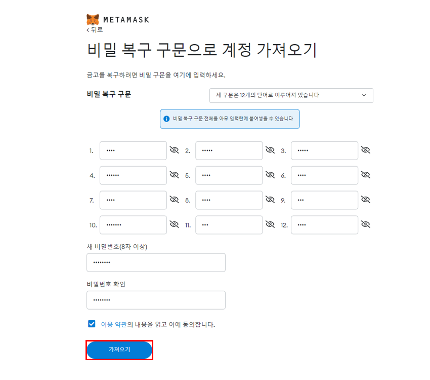 "지갑 가져오기"를 클릭하면 비밀 복구 구문으로 계정 가져오기 화면이 보입니다. 생성된 Mnemonic과 비밀번호를 입력하고 "가져오기" 버튼을 클릭합니다.