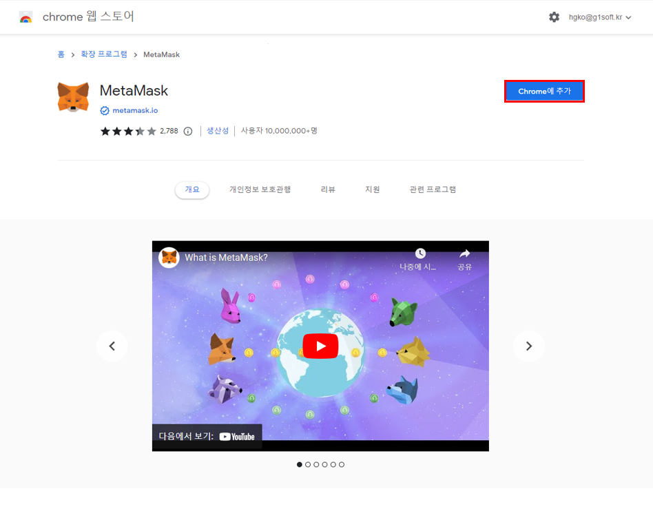 크롬 웹 스토어 창이 열리게 되고 "Chrome에 추가" 버튼을 클릭합니다. 크롬 확장프로그램에 MetaMask가 추가됩니다.