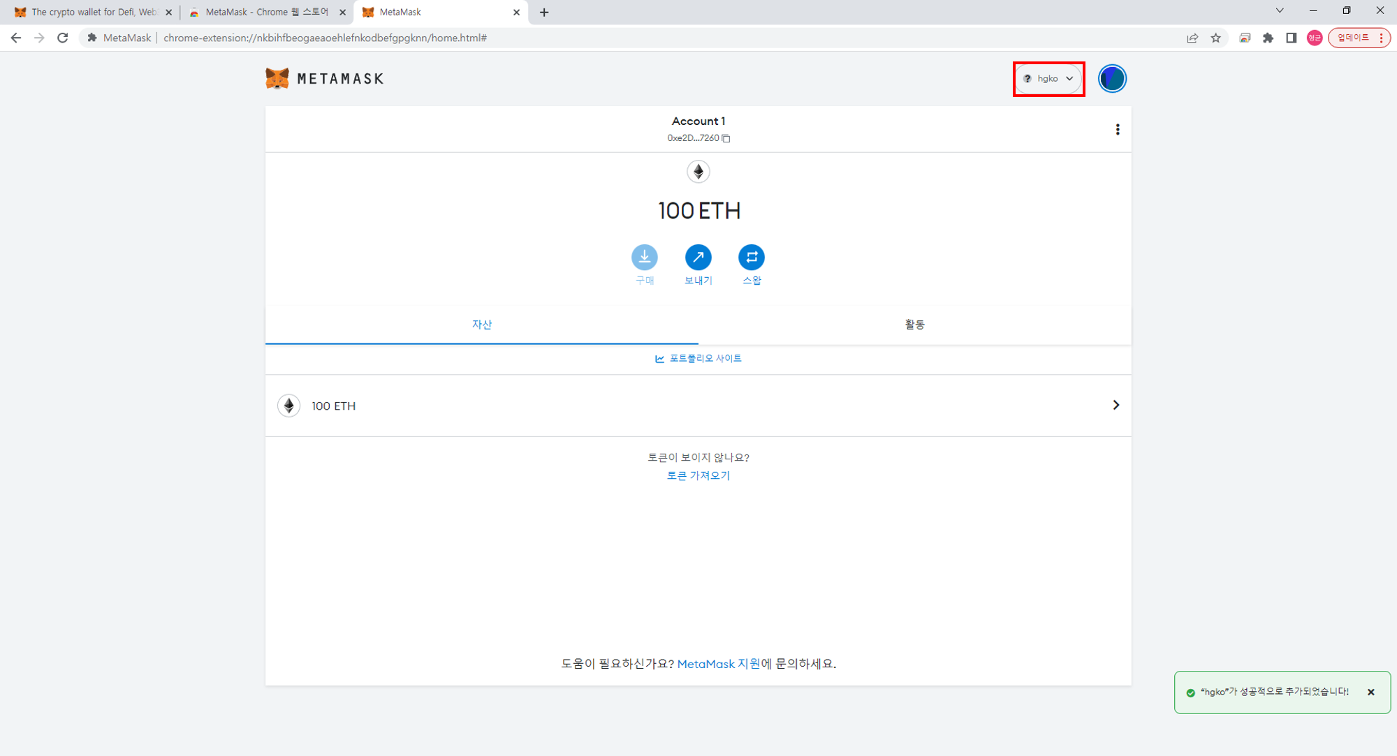 추가된 네트워크가 보이며 선택 시 계정 정보가 보입니다.