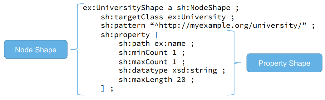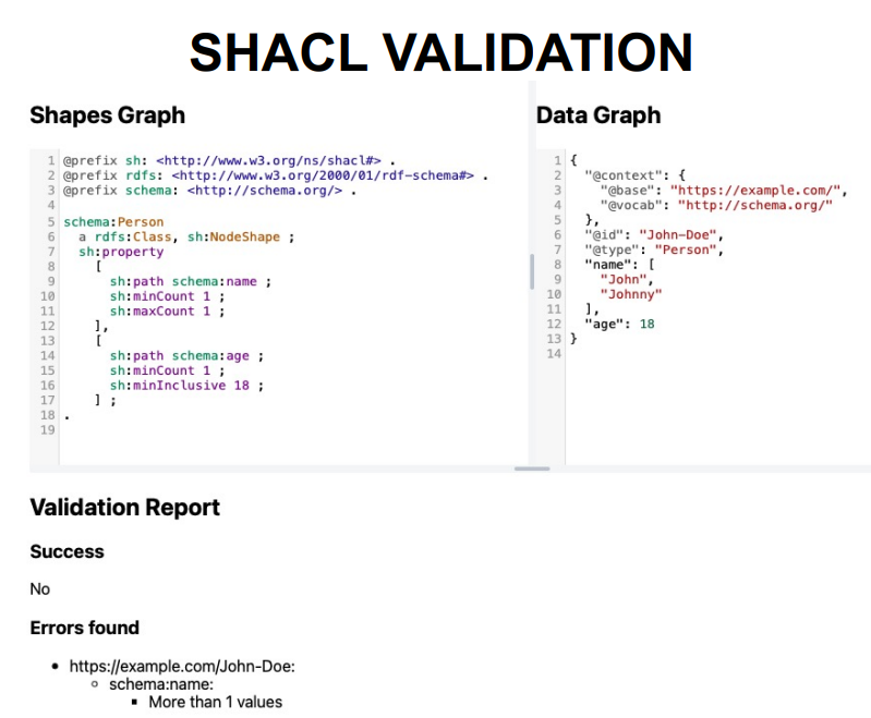 - SHACL은 데이터를 검증하는 데 사용되는 "Shapes Graph"를 정의합니다.