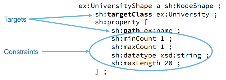 - Targets: data graph에서 어떤 노드가 shape을 준수해야 하는지 정의합니다.