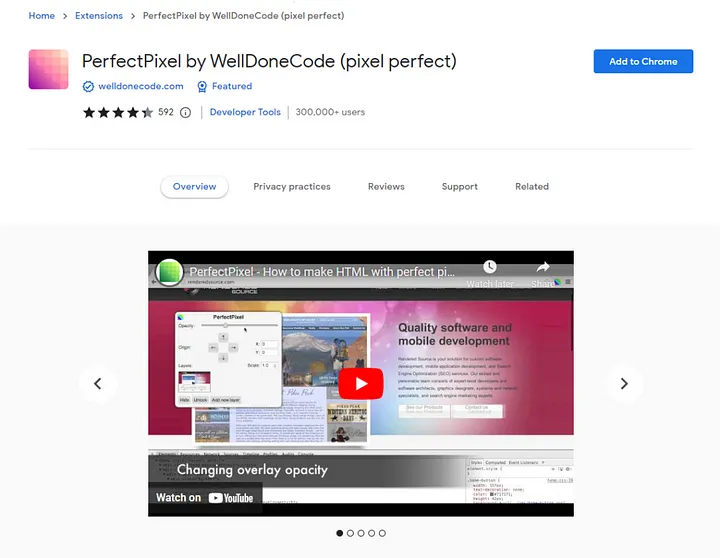 Perfect Pixel 확장 프로그램은 웹페이지에 반투명 사진을 오버레이할 수 있는 도구입니다. 이를 통해 웹페이지 디자인이 원본 목업 또는 PSD 파일과 완벽하게 일치하는지 확인할 수 있습니다.
