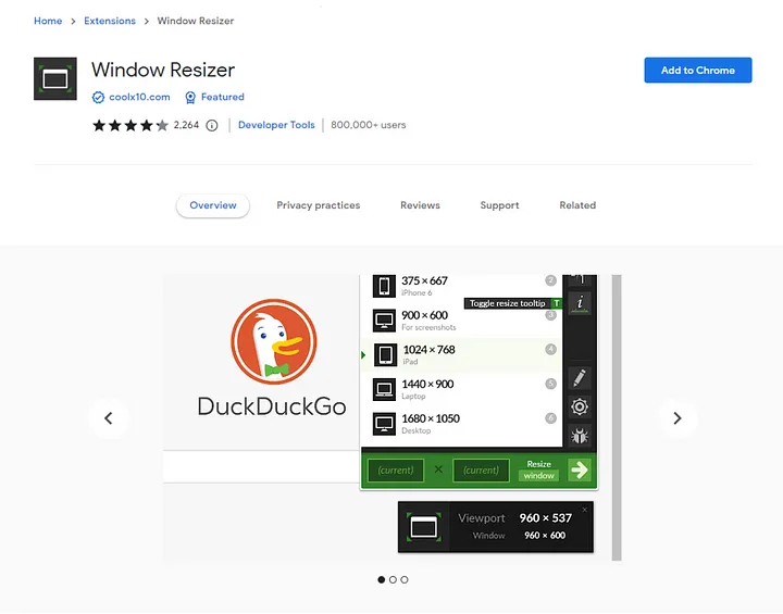 Window Resizer 확장 프로그램은 반응형 웹 디자인을 테스트하는 데 도움이 됩니다. 브라우저 창 크기를 특정 크기로 조정할 수 있으며 다양한 화면 크기와 기기에서 웹사이트가 어떻게 보이는지 미리 볼 수 있습니다.