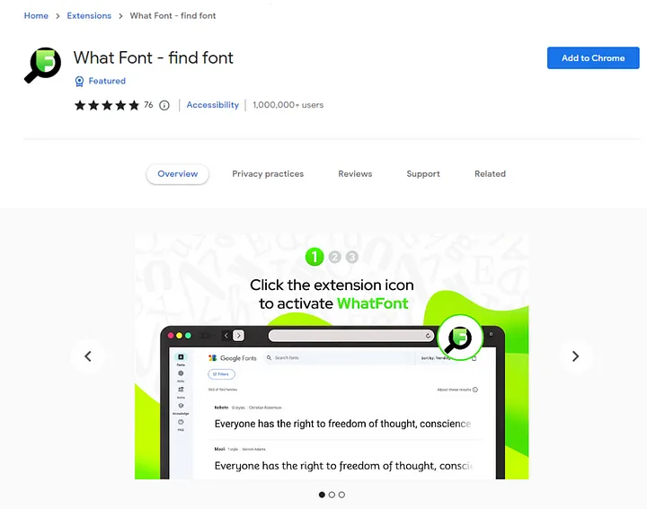 What Font 확장 프로그램은 웹 페이지에 사용된 글꼴을 식별하는 데 유용합니다. 텍스트 위에 마우스를 올려놓기만 하면 글꼴 이름과 스타일이 표시됩니다. 웹사이트에서 타이포그래피를 발견하는 데 정말 유용합니다.
