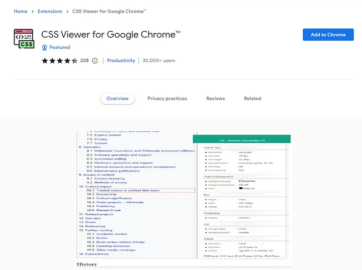 CSS Viewer 확장 프로그램을 사용하면 웹페이지의 모든 부분의 CSS 스타일을 확인할 수 있습니다. 클릭 한 번으로 작은 팝업 창에 해당 요소의 CSS 규칙이 표시됩니다. 사용하기 쉽지만 정말 유용합니다.