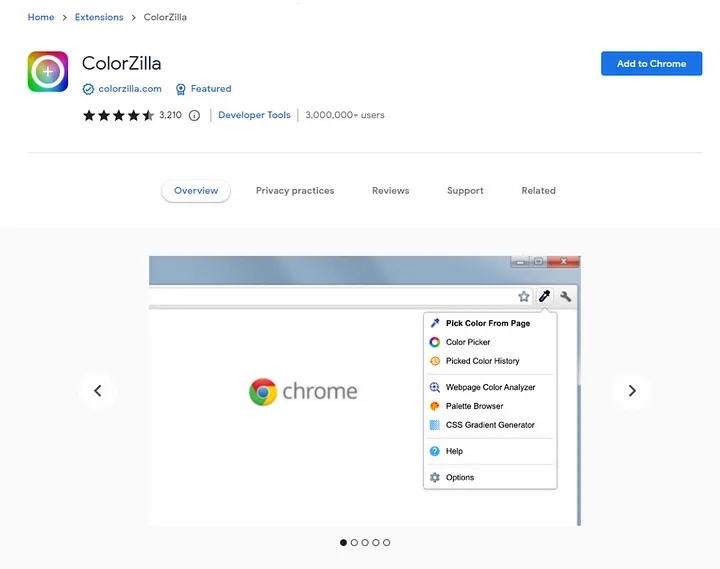 ColorZilla 확장 프로그램은 웹페이지에서 색상을 고를 때 유용합니다. 이 확장 프로그램을 사용하면 다양한 형식의 색상을 빠르게 식별하고 복사할 수 있습니다.