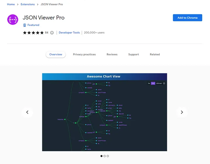 JSON Viewer 확장 프로그램은 JSON 데이터를 다루는 웹 개발자를 위한 필수 확장 프로그램입니다. JSON 응답의 형식을 지정하고 색상 코드를 지정하여 읽고 탐색하기 쉽게 해줍니다.
