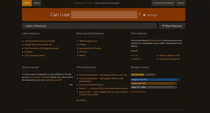 CSS를 작성할 때는 브라우저 호환성을 파악하는 것이 중요합니다. Can I Use을 사용하여 최신 브라우저 지원 표를 확인할 수 있습니다.