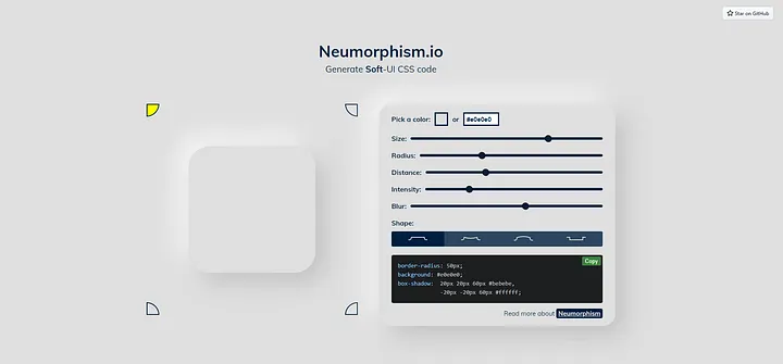 Neumorphism or soft UI를 사용하여 뉴모픽 요소를 생성하고 해당 CSS 코드를 가져와 요소에 물리적 객체의 모양을 부여할 수 있습니다.