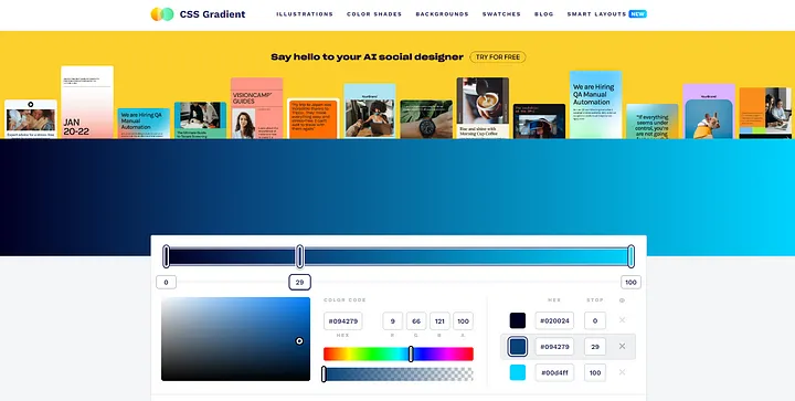 CSS Gradient Generator는 복잡한 CSS 그라디언트를 쉽게 만들 수 있습니다. 또한 해당 CSS 코드도 제공합니다.