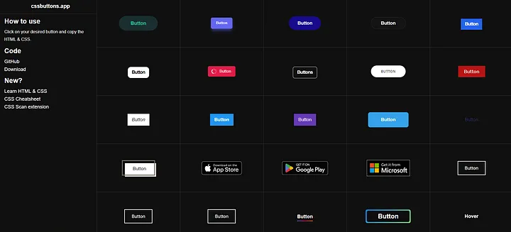 CSS Buttons을 사용하면 버튼 디자인 과정을 간소화할 수 있습니다. 이 웹사이트는 작업을 더 빠르게 완료할 수 있도록 해당 CSS 코드와 함께 사용자 정의 가능한 버튼 스타일의 훌륭한 컬렉션을 제공합니다.