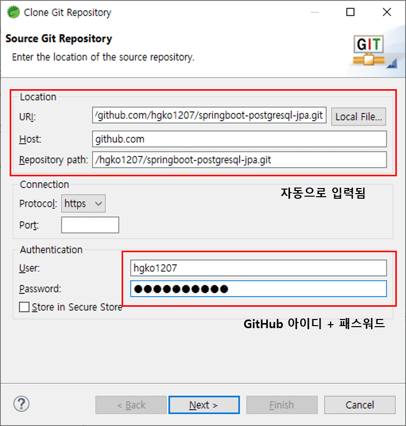 Clone Git Repository 창의 첫 번째 빨간 박스에 앞에서 복사해 둔 Git 원격 저장소 주소를 URI 칸에 복사하면 Host, Repository path 칸에 자동으로 입력됩니다. 그 밑의 빨간 박스에는 깃허브 아이디와 패스워드를 입력하고 [Next] 버튼을 클릭합니다.