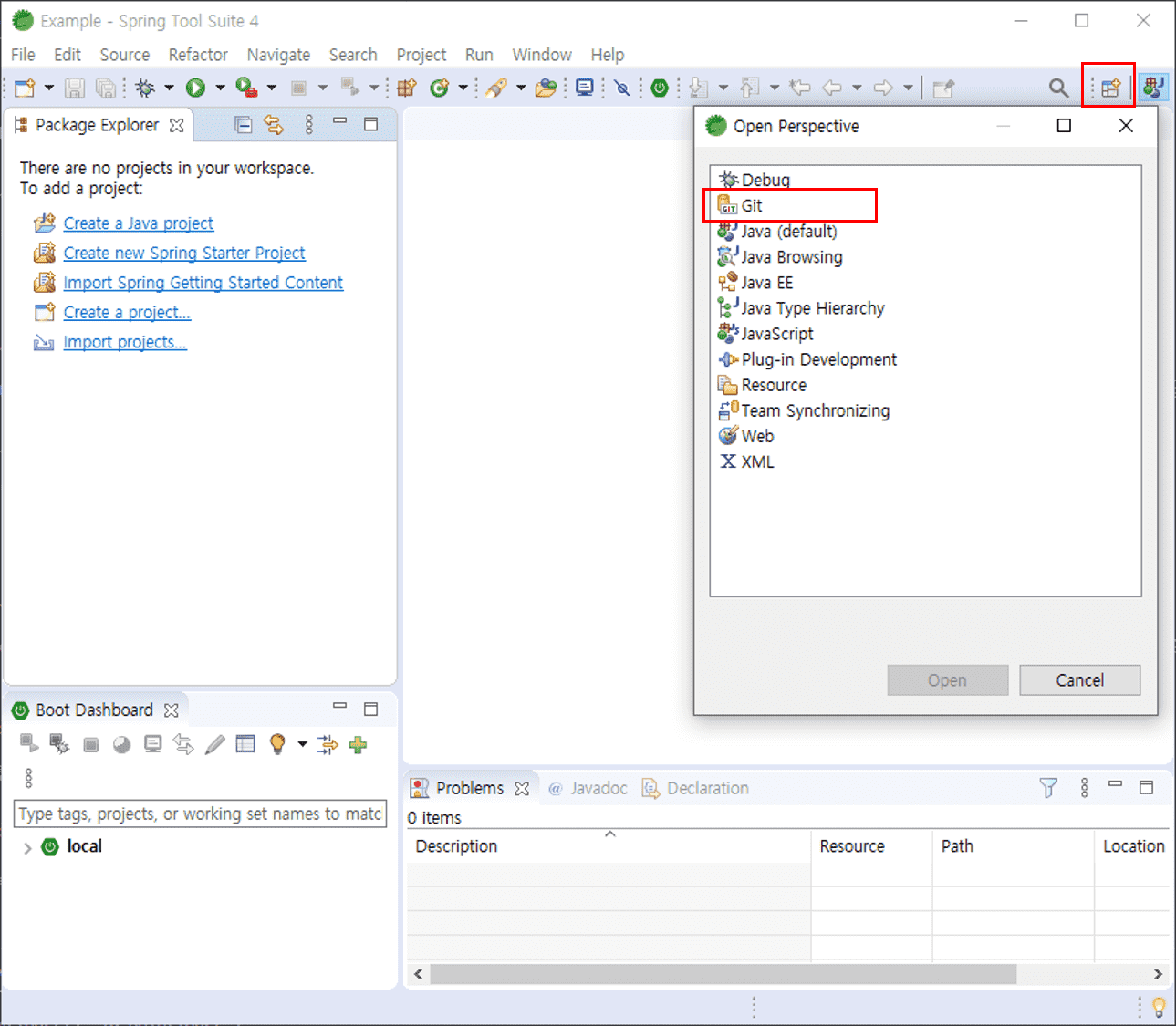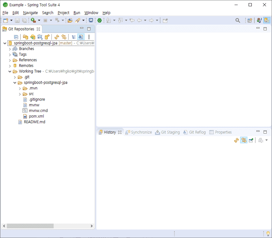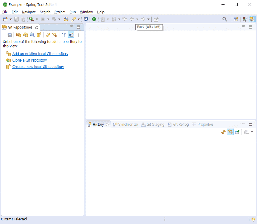 Git을 선택하고 [OK] 버튼을 눌러 활성화시킵니다. Git 퍼스펙티브가 추가된 것을 볼 수 있으며 아이콘을 클릭하면 아래 그림처럼 기본화면이 변경됩니다.