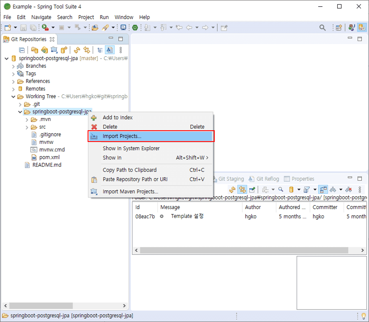 연동된 원격저장소에서 Working Tree -> 프로젝트 선택 -> 우클릭 -> Import Projects 선택을 합니다.