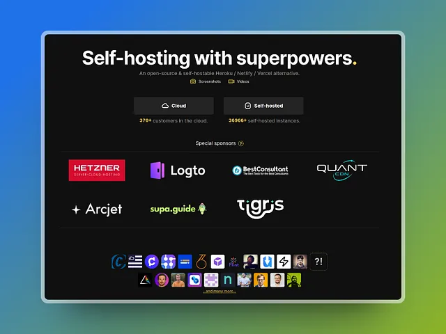 Coolify는 개발자에게 강력한 자체 호스팅 기능을 제공하여 Heroku, Netlify, Vercel에 대한 오픈 소스 대안을 제공합니다. 원활한 Git 통합, 무료 SSL 인증서, 자동 백업을 통해 정적 사이트에서 API 및 데이터베이스에 이르기까지 모든 서버(VPS부터 Raspberry Pi까지)에 배포하세요. 강력한 API와 효율적인 프로젝트 관리를 위한 협업 기능으로 공급업체 종속 없이 데이터와 운영을 완벽하게 제어할 수 있습니다.
