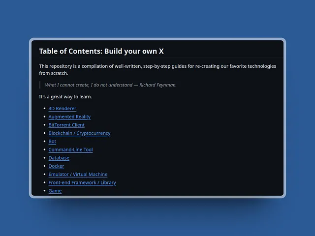 Build Your Own X은 인기 있는 기술을 처음부터 다시 만들 수 있도록 단계별 가이드가 포함된 종합적인 리포지토리입니다. "내가 만들 수 없는 것은 내가 이해하지 못한다"는 리처드 파인만의 원칙에서 영감을 받은 이 컬렉션은 3D 렌더러, 증강 현실, BitTorrent 클라이언트, 블록체인 등 다양한 프로젝트를 다룹니다. 복잡한 시스템을 직접 구축하여 딥러닝과 이해를 돕는 훌륭한 리소스입니다.