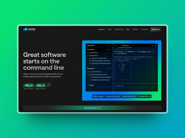 Warp는 생산성을 높이기 위해 AI와 협업 도구로 터미널을 재구성합니다. 속도를 위해 Rust로 구축되어 최신 편집, 명령 생성 및 재사용 가능한 워크플로우를 제공합니다. 워프 AI는 즉각적인 명령어 제안과 디버깅 지원을 제공하며, 워프 드라이브는 터미널 워크플로를 구성하고 공유하는 데 도움을 줍니다. 테마가 있는 사용자 지정 가능한 인터페이스를 통해 터미널 환경을 개선하세요.