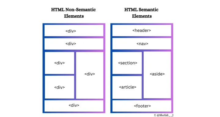 웹사이트에 non-semantic 요소보다 시맨틱(semantic) 요소를 선택하세요. 시맨틱 요소는 코드를 의미 있게 만들고 구조, 접근성 및 SEO를 개선합니다.