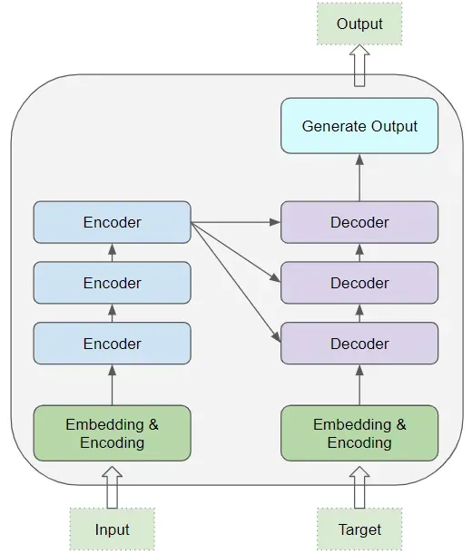 트랜스포머의 아키텍처는 다소 복잡하며, 짧은 글에서 설명하기 어렵지만, 여기서 간단하게 개략적인 설명을 드리겠습니다. 트랜스포머는 인코더(Encoder)와 디코더(Decoder)로 구성됩니다. 인코더는 동일한 레이어들의 스택으로 이루어져 있으며, 텍스트를 처리하여 디코더에 필요한 중요한 정보를 제공합니다. 디코더는 이 입력을 받아, 동일한 레이어 스택을 통해 우리가 원하는 출력을 생성하는 역할을 합니다. 아래 그림은 이 아키텍처를 보여주는 이미지입니다.